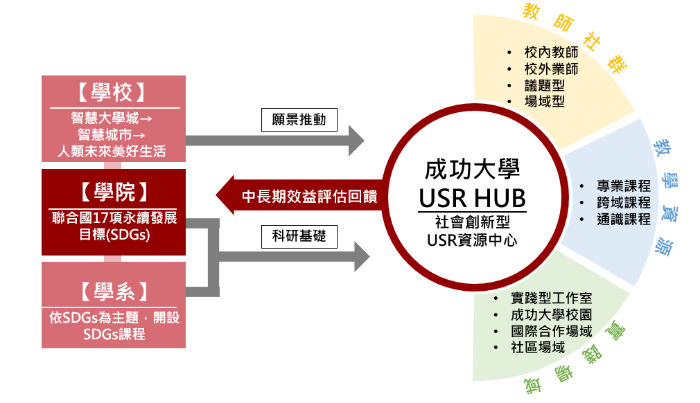 自2023年起本校於人文社會科學中心設立「社會創新型USR資源中心」(以下簡稱USR資源中心)作為USR推動平臺,由副校長擔任學校整體召集人,人社中心主任擔任執行長,作為USR校務橫向連結之主層級,整合校內處室、院系的資源,發展跨領域的課程與實作行動。
